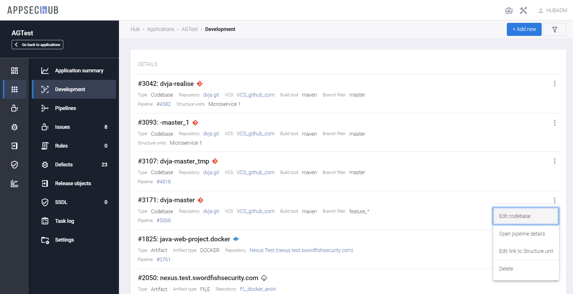 При удалении кодовой базы на странице Development она также удаляется из Security Pipeline, где она используется.