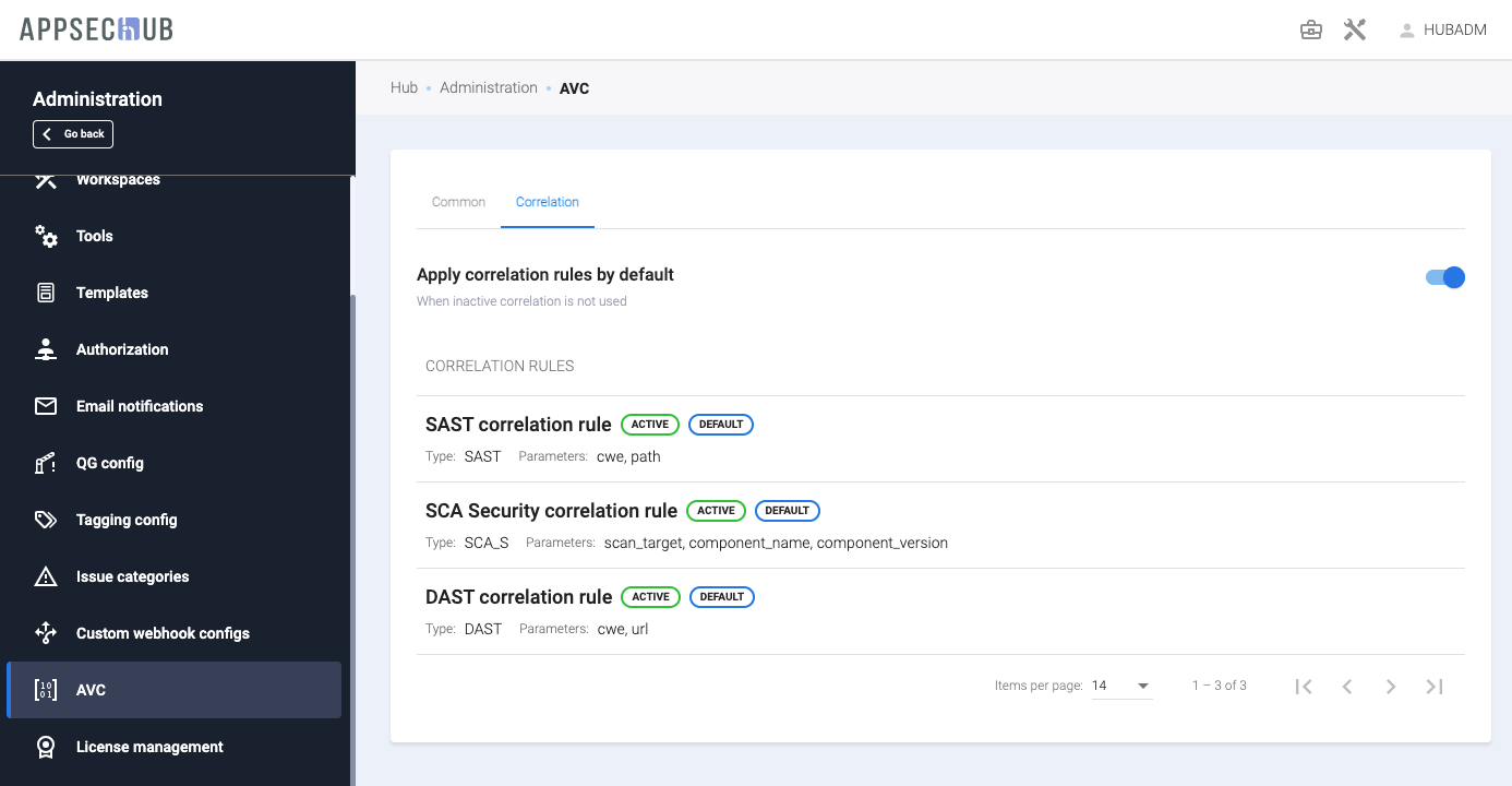 Выберите пункт меню AVC (Application Vulnerabilities Correlation) в меню слева, чтобы обновить настройки корреляции уязвимостей приложения (AVC). Страница AVC содержит две вкладки: Common и Correlation.