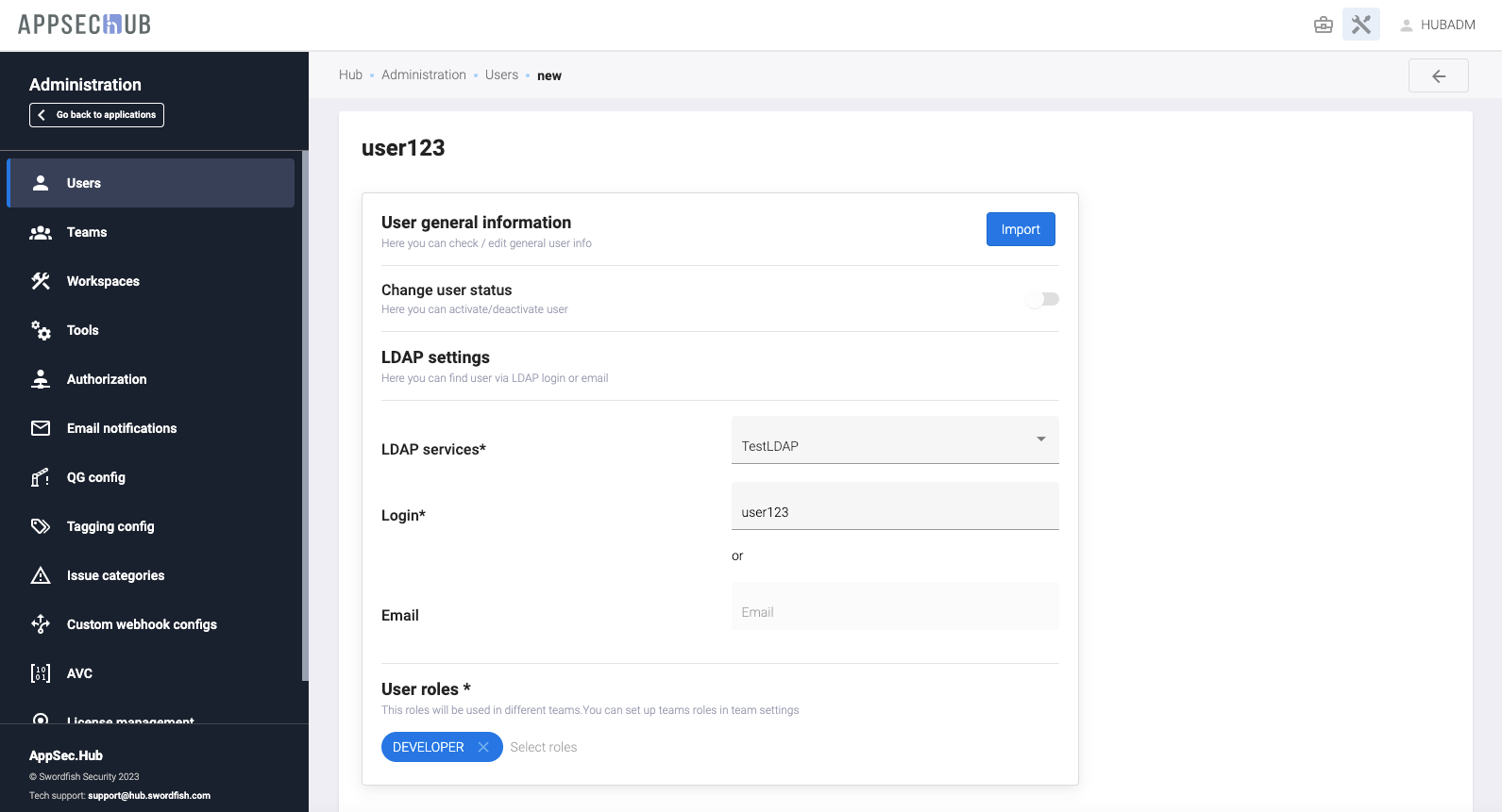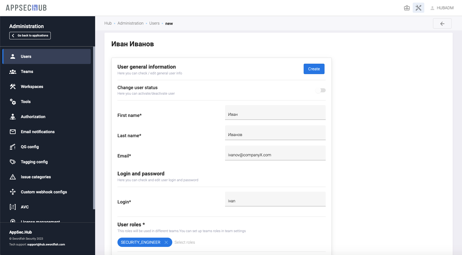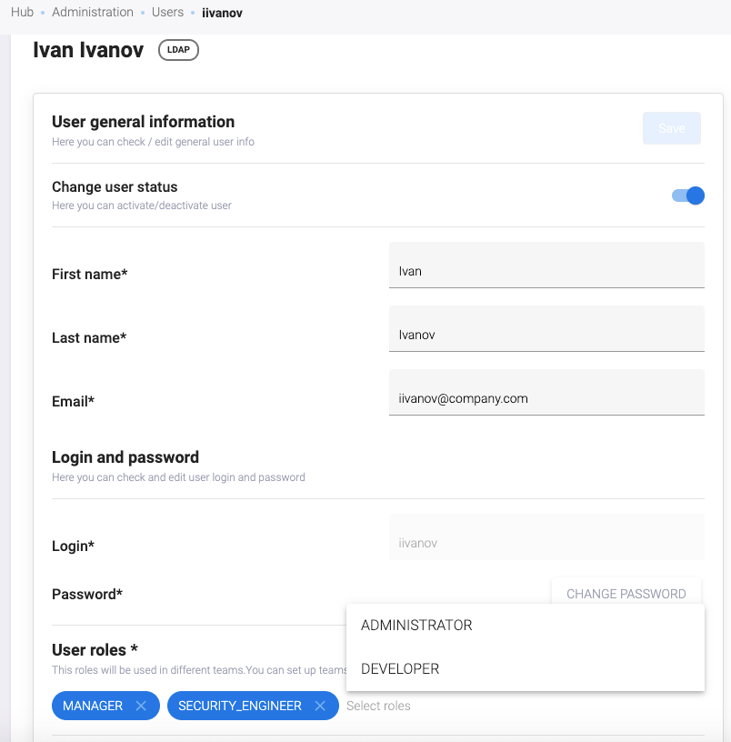 Выберите роль(и) пользователя в поле User roles (Administrator, Manager, Security Engineer, Developer).