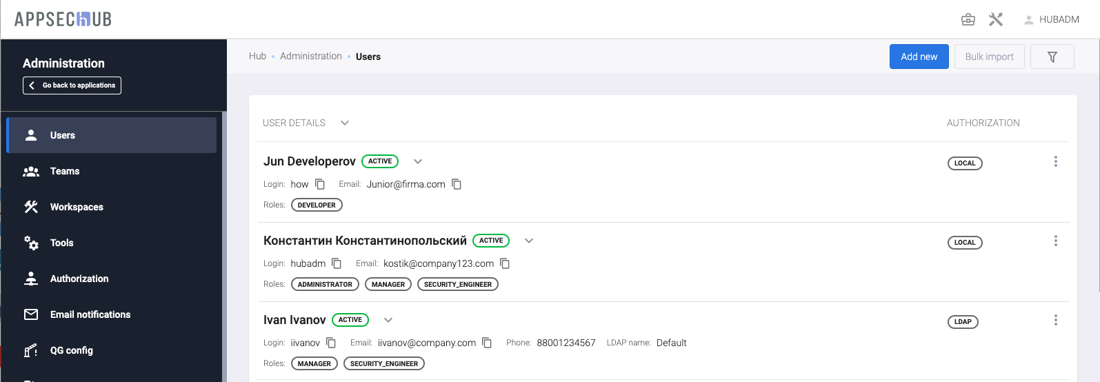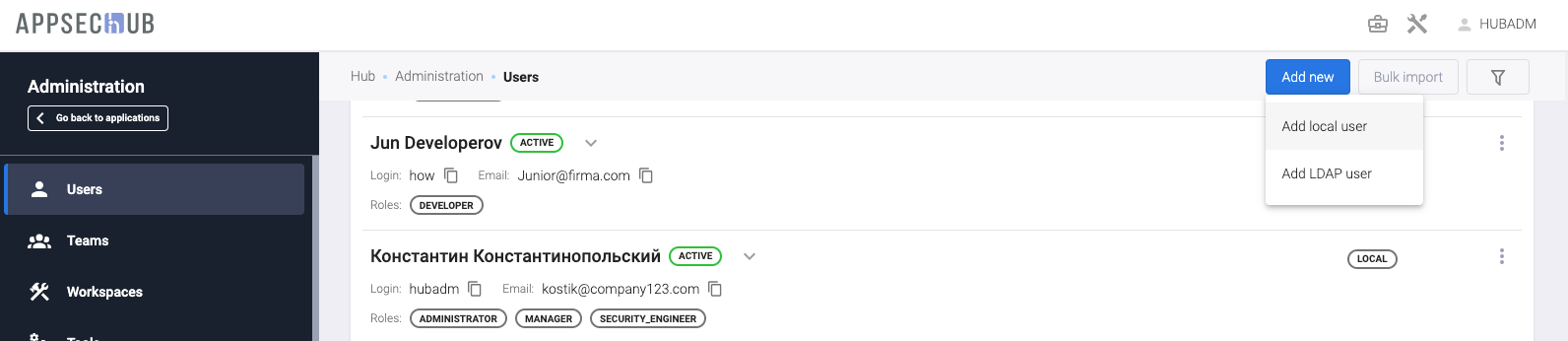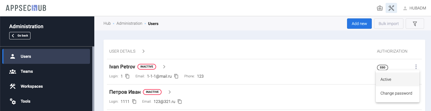 Можно фильтровать пользователей по типу авторизации — Local (AppSec.Hub)/LDAP/SSO (with auth type) или по состоянию — активные/пассивные (with state).