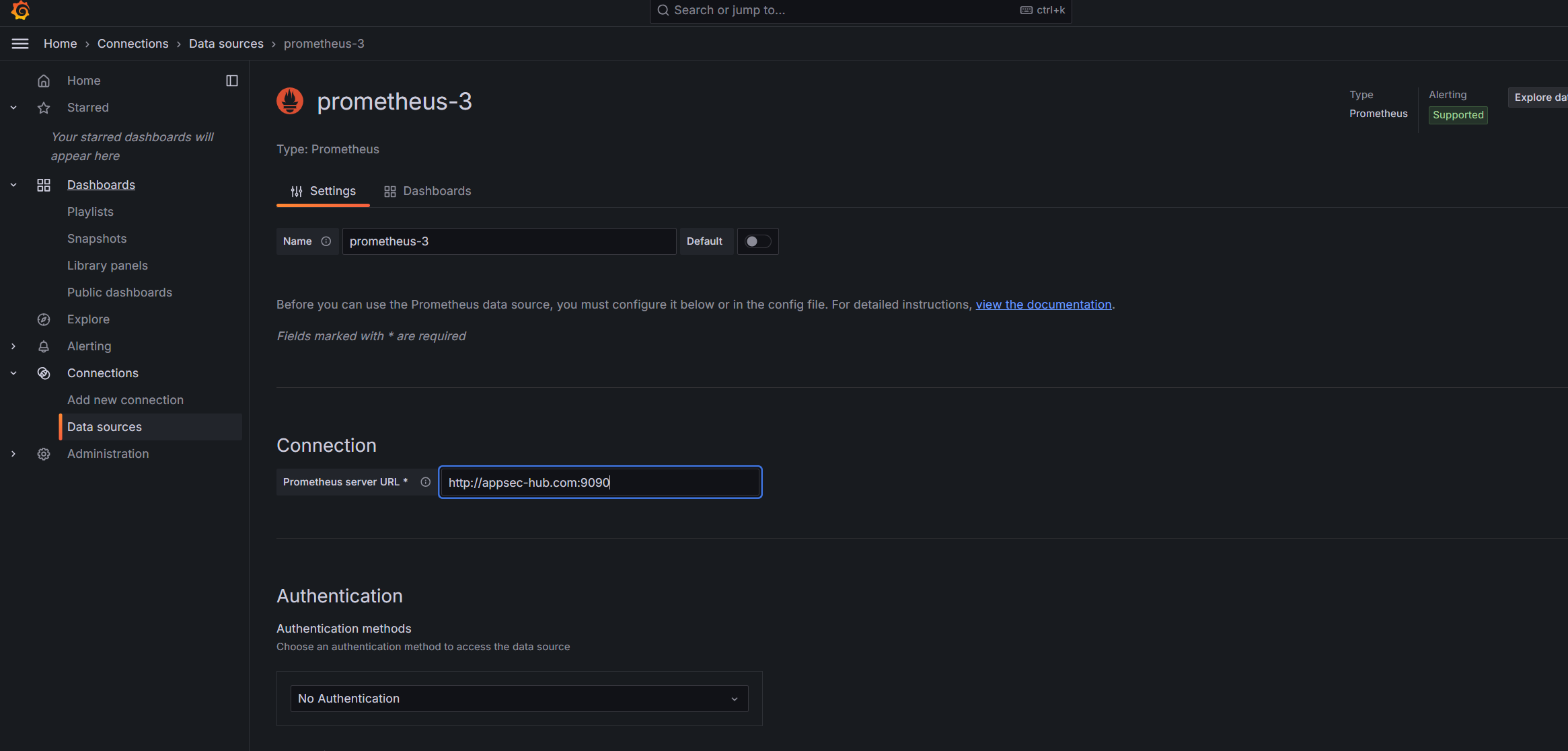 Установите иcточник данных в пункте меню Data sources в разделе Connections. Выберите Prometheus и добавьте URL Prometheus с портом 9090 в поле Connection.