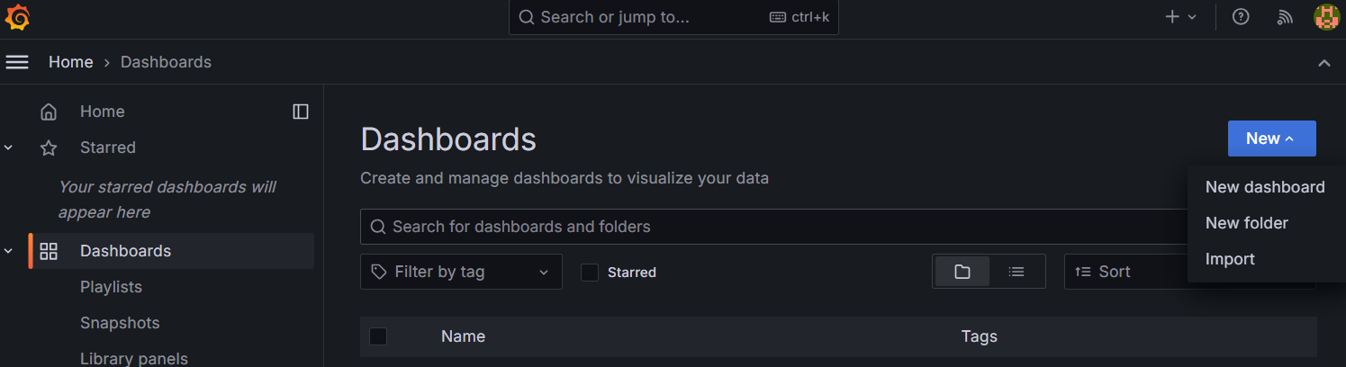 Для добавления новой информационной панели (дашборда) выберите пункт меню Dashboards. Нажмите на кнопку New и в выпадающем меню выберите пункт New dashboard.