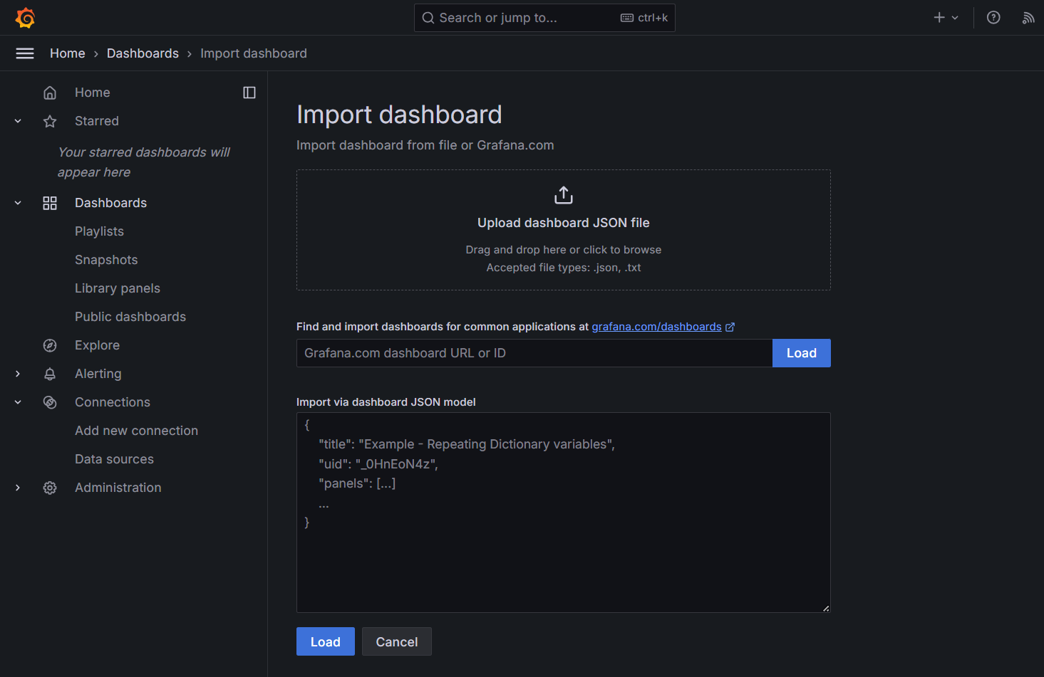 Импортируйте дашборд, загрузив JSON-файл дашборда в разделе Import dashboard. Пример JSON-файла.