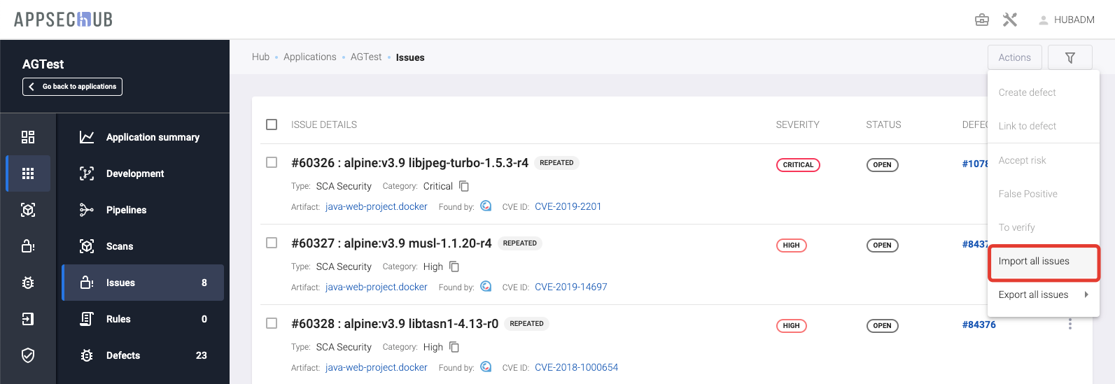Чтобы импортировать проблемы для нескольких приложений из ранее проведенных сканирований, на главном экране AppSec.Hub выберите в меню пункт Issues.