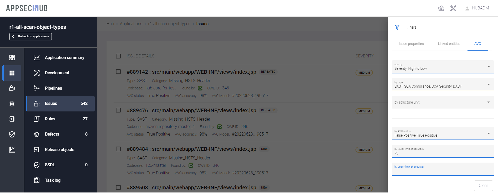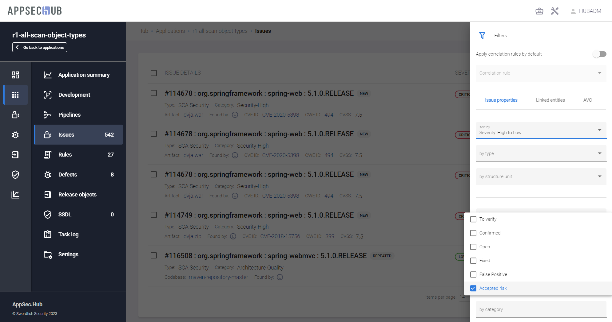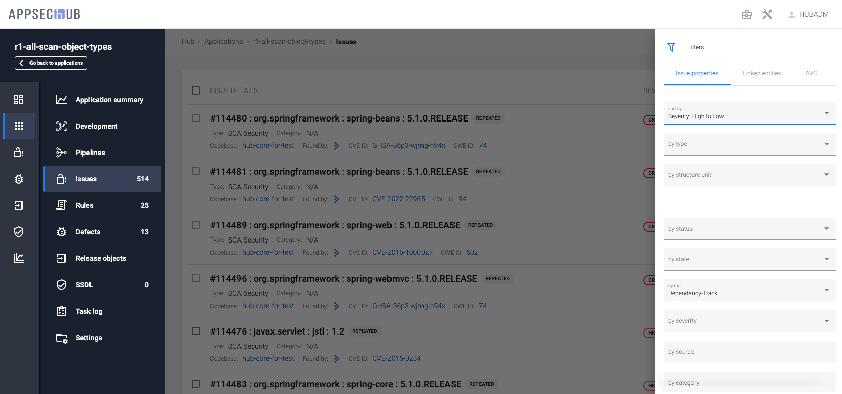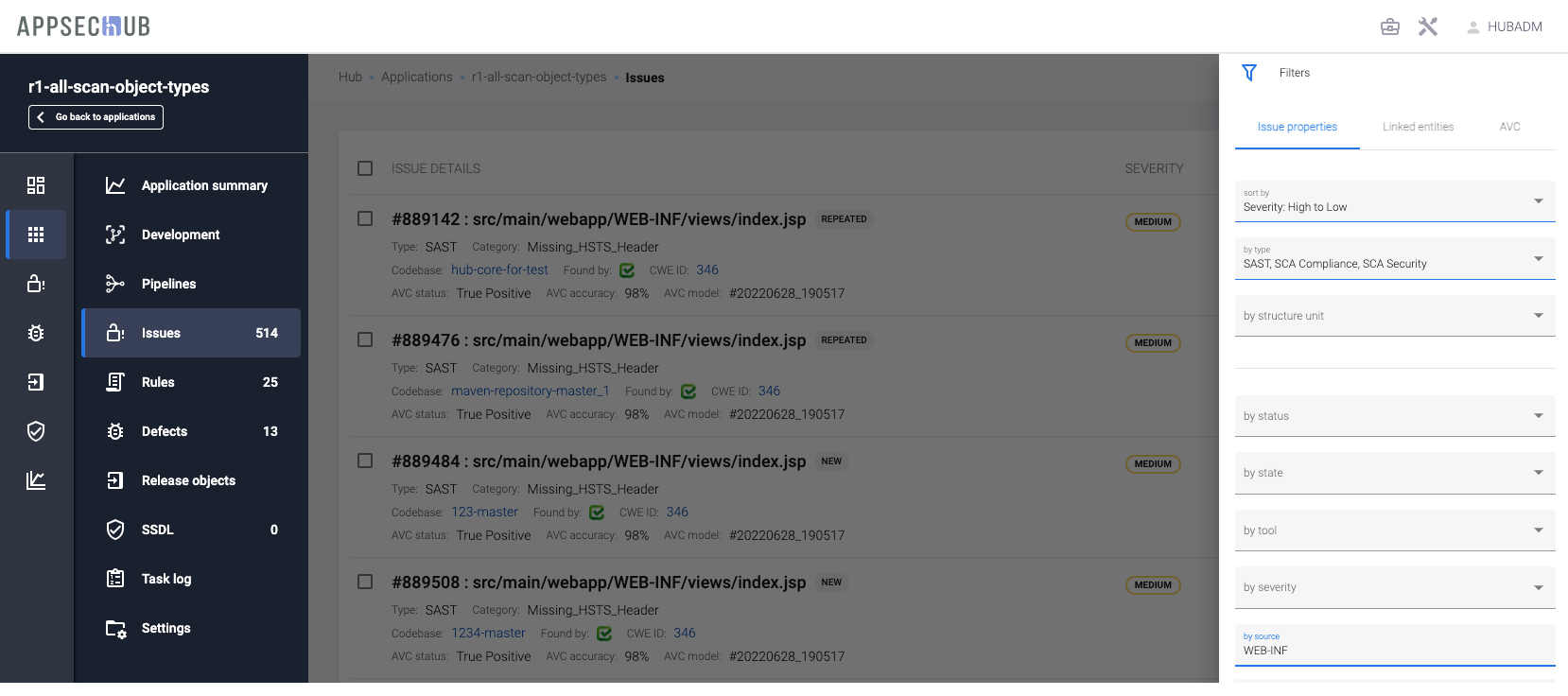 Кроме того, на общей странице проблем безопасности Issues можно задать фильтр по приложению — by application. После того, как в поле by application выбрано приложение, можно поставить дополнительный фильтр на структурные единицы приложения в поле by structure unit.