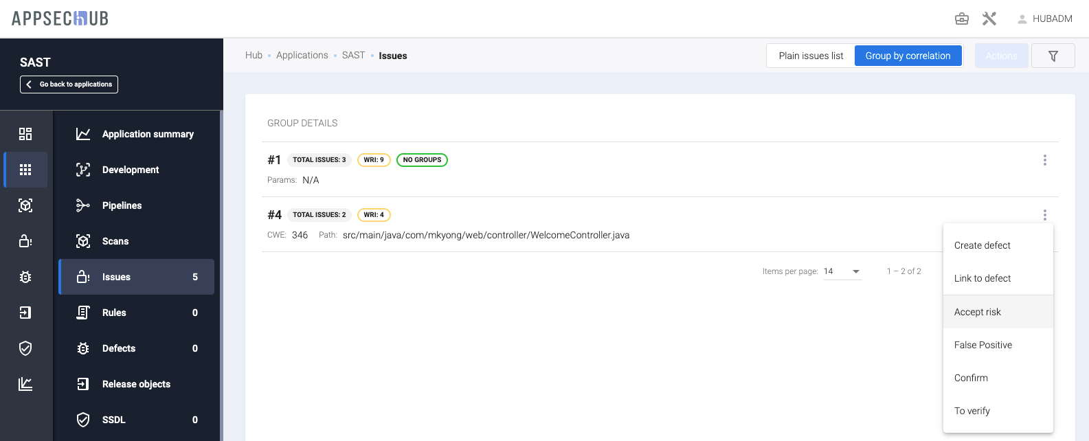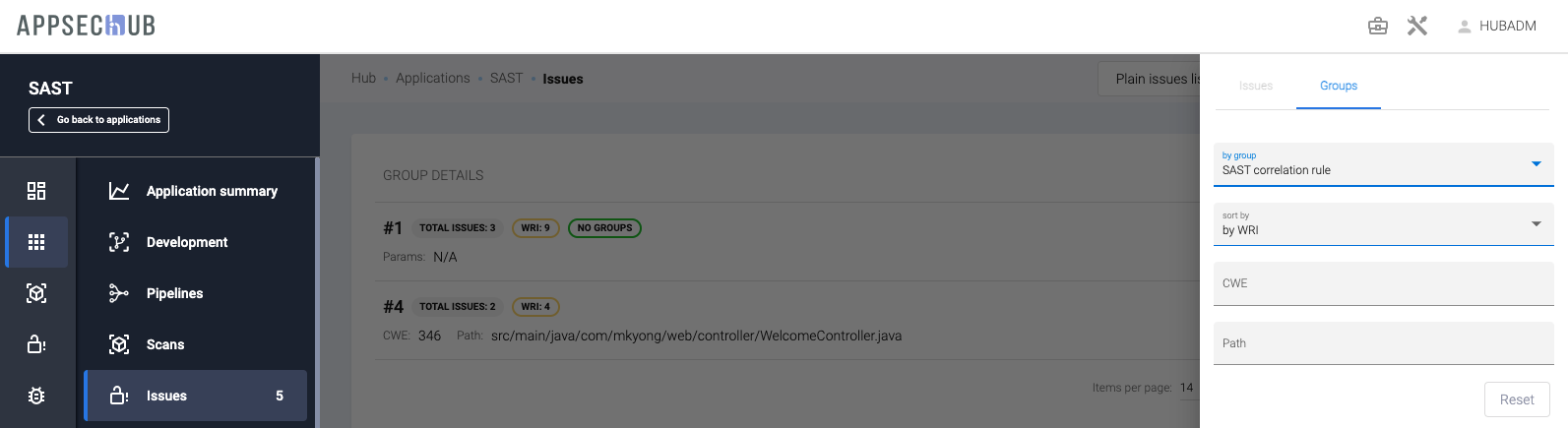 AppSec.Hub предоставляет информацию и позволяет работать с проблемами безопасности как для одного выбранного приложения, так и для всех приложений, к которым пользователь имеет доступ. Информация о проблемах безопасности всех доступных пользователю приложений отображается на общей странице проблем безопасности Issues. По сути, собранная на этой странице информация объединяет и дублирует все сведения о проблемах безопасности, содержащиеся на страницах Issues для каждого отдельного приложения.