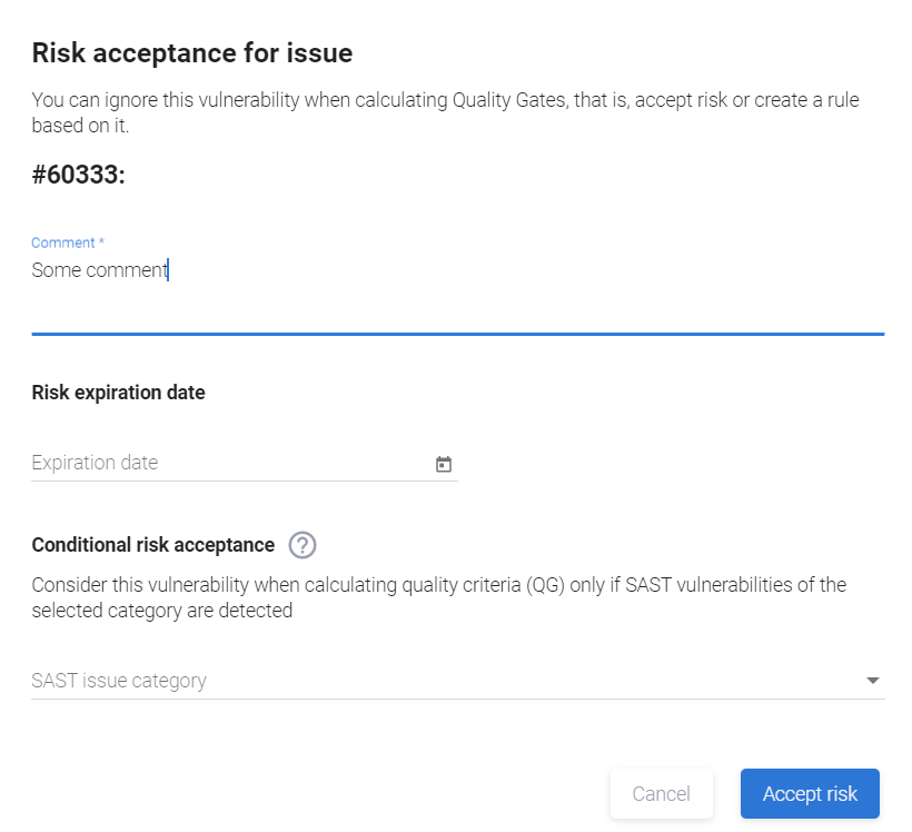 Условное принятие риска для нескольких проблем безопасности доступно только для SCA Security уязвимостей. Если среди выбранных уязвимостей будет хотя бы одна SCA Compliance, SAST или DAST уязвимость, возможно только безусловное принятие риска.