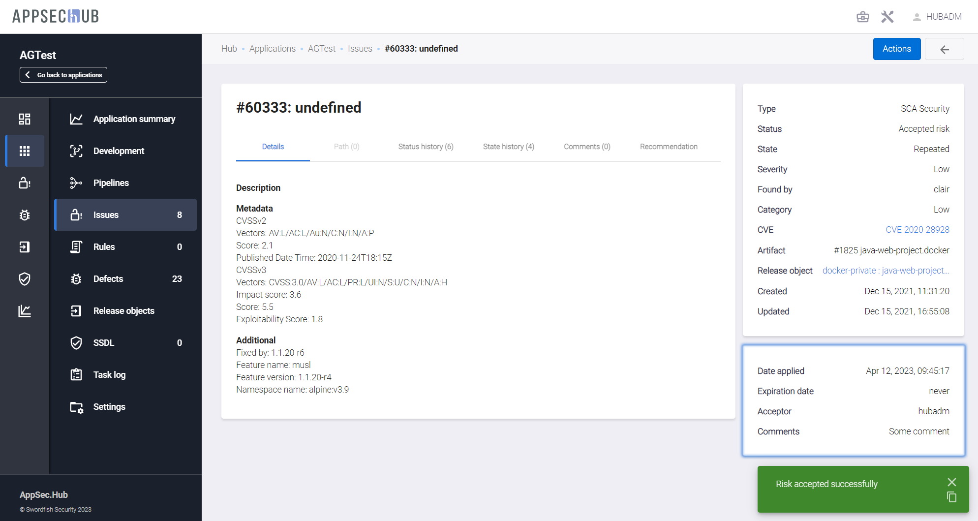 AppSec.Hub анализирует историю каждой проблемы безопасности. Если проблема была обнаружена во время сканирования безопасности, но затем не обнаружена во время следующего сканирования, она автоматически получает статус Fixed.