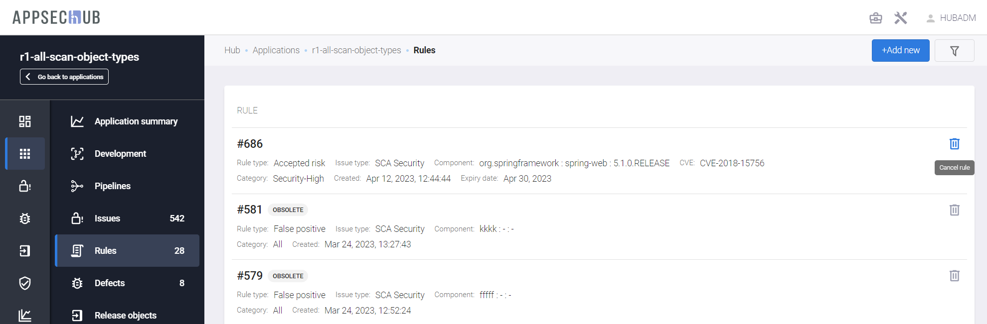 В AppSec.Hub запрещено создавать одинаковые правила, а также правила с несуществующими объектами.