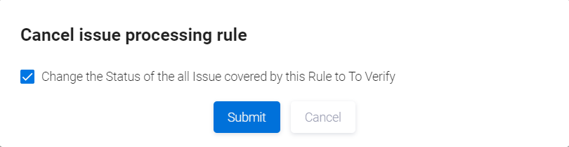 В появившемся диалоговом окне Cancel issue processing rule нажмите кнопку Submit, чтобы отменить правило. Если выбрана опция Change the Status of the all Issue covered by this Rule to To Verify, статус всех проблем безопасности, которым в соответствии с данным правилом был присвоен статус False positive/Accepted risk/Confirmed, будет изменен на To Verify, также будут удалены комментарии и срок истечения действия удаляемого правила. В противном случае, если данная опция не была выбрана, у уязвимостей останутся без изменений статус, комментарии и срок истечения, до которого будет действовать текущий статус False positive/Accepted risk/Confirmed (после удаления правила этот статус можно будет поменять на To Verify вручную).