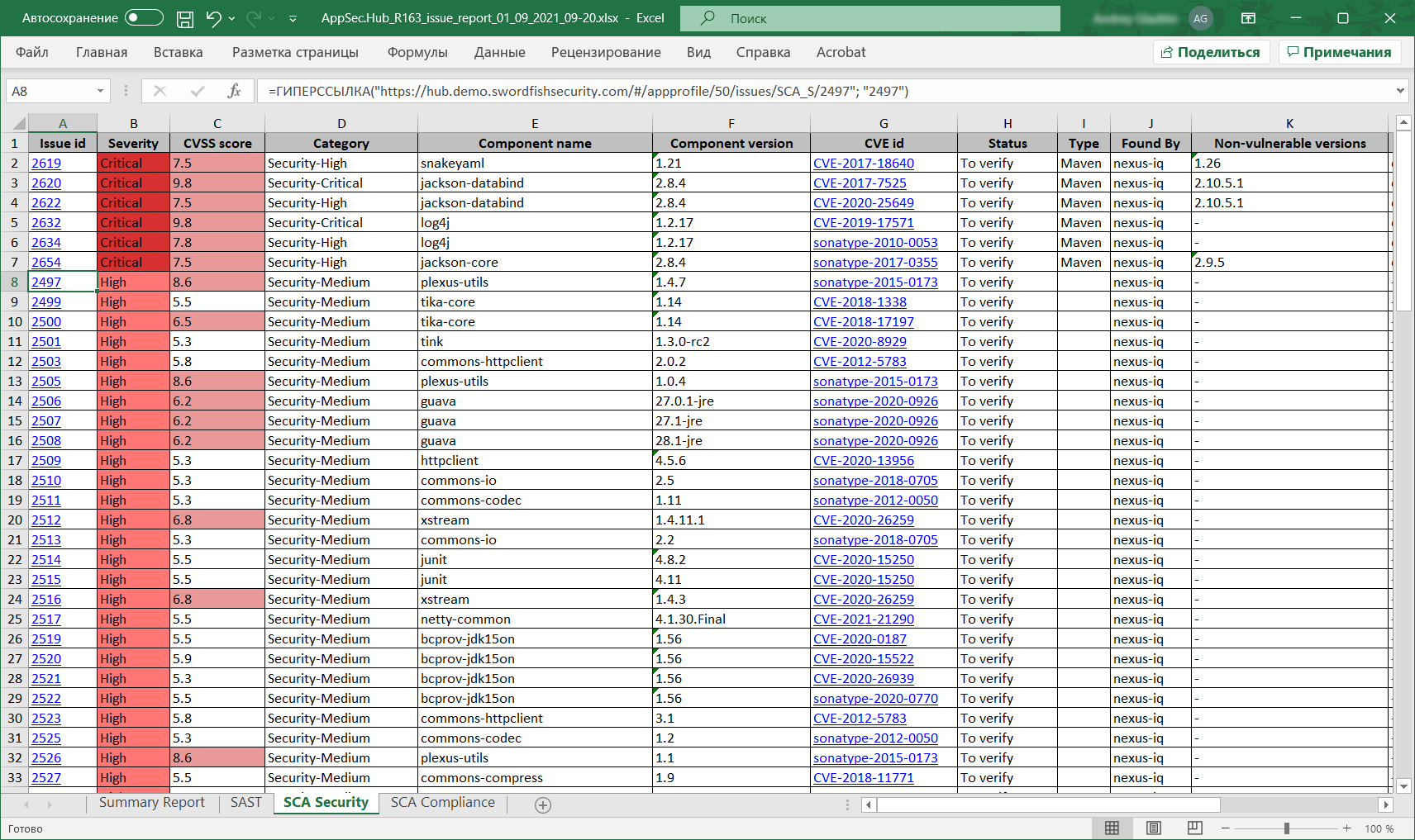 Не останавливаясь подробно на структуре отчетов, отметим, что в них, помимо прочего, реализовано отображение ссылок на уязвимости, обнаруженные продуктами Sonatype (CVE id), а также безопасных версий библиотек (Non-vulnerable versions).