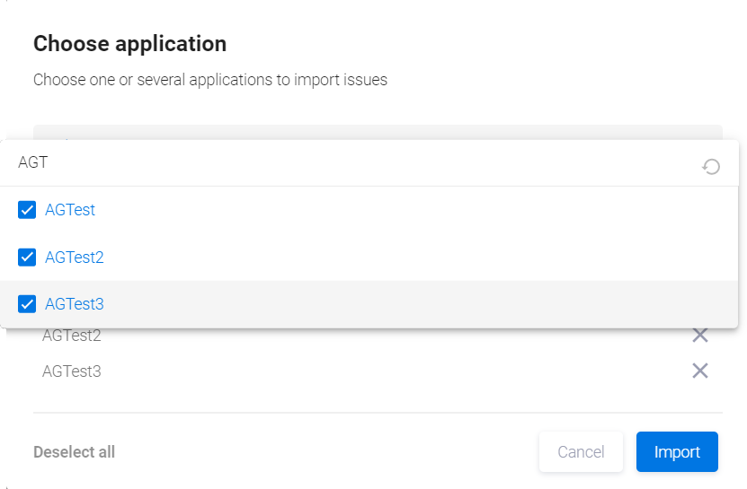 Выберите в этом окне приложения, для которых необходимо импортировать проблемы. Чтобы выбрать все доступные пользователю приложения, нажмите пункт Select all. Отдельные приложения можно выбрать, нажав на выпадающее меню Enter Application Name. Можно воспользоваться поиском нужных приложений, введя имя или часть имени приложения в поле Search.