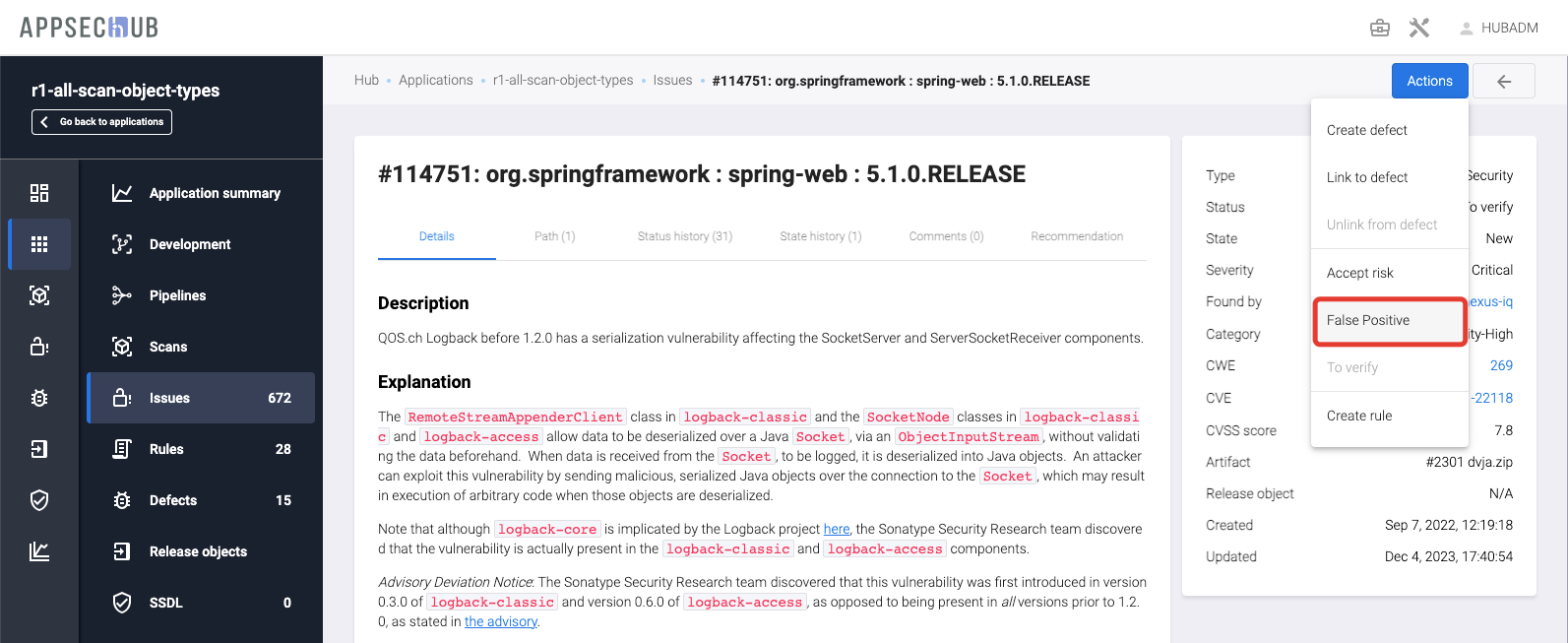 False Positive — с помощью этого пункта можно отмечать проблемы безопасности, имеющие статус To verify, которые являются результатом ложных срабатываний инструментов сканирования, см. раздел «Присвоение проблеме безопасности статуса False positive».