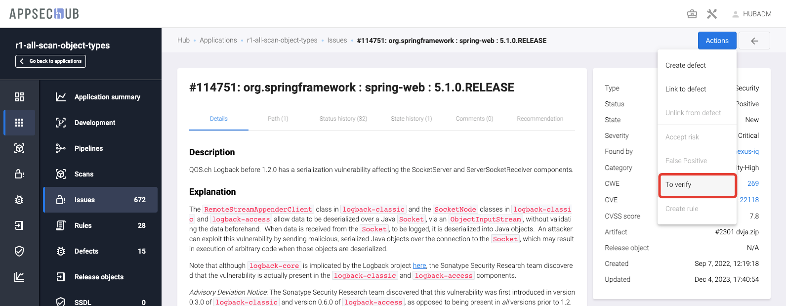 To verify — с помощью этого пункта можно перевести в статус To verify проблему безопасности, находящуюся в статусе False positive, Accepted risk или Confirmed.