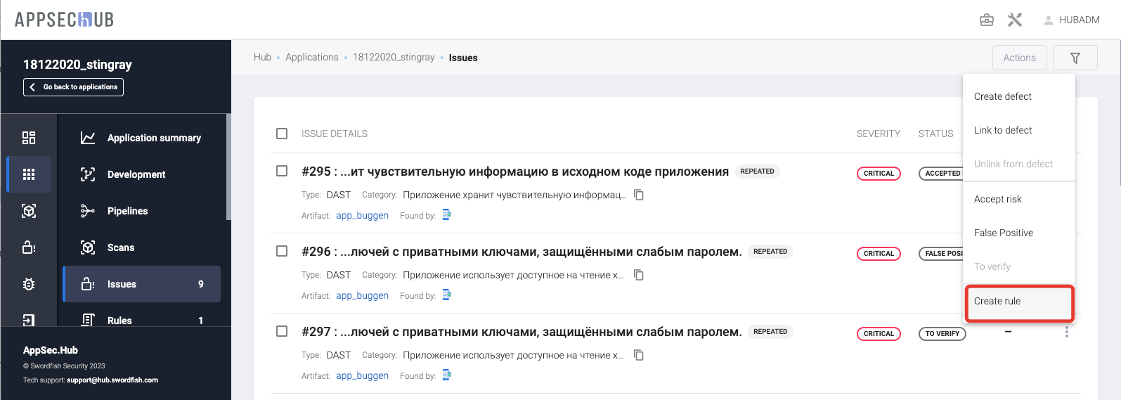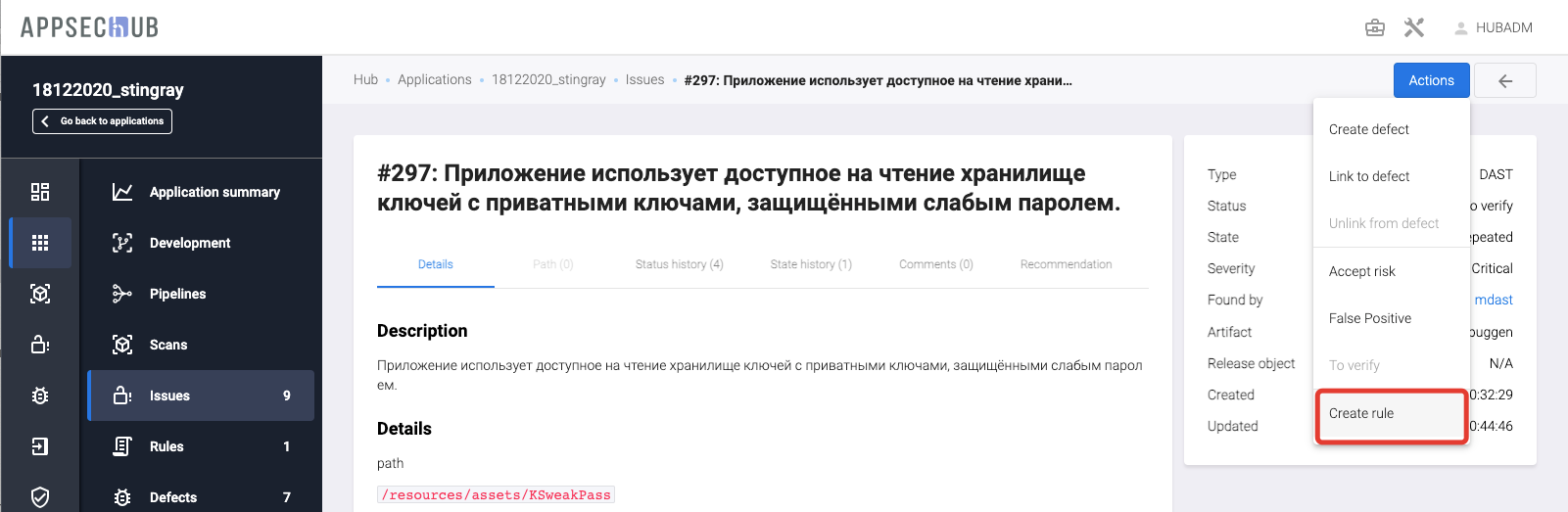 Create rule — этот пункт используется для присвоения проблеме безопасности статуса False positive, Accepted risk или Confirmed одновременно с созданием в системе соответствующего правила для текущего приложения, см. разделы «Присвоение проблеме безопасности статуса False positive с созданием правила», «Безусловное и условное принятие риска с созданием правила» и «Присвоение проблеме безопасности статуса Confirmed с созданием правила».