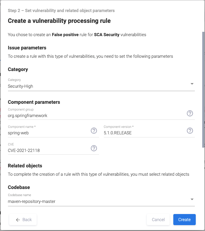 В открывшемся окне Create a vulnerability processing rule заполните или отредактируйте необходимые поля аналогично тому, как описано выше в разделе «Присвоение проблеме безопасности статуса False positive с созданием правила». Часть полей данного окна будет заполнена автоматически на основе информации, полученной из инструмента AST. В поле Select rule type необходимо выбрать тип создаваемого правила Confirmed.