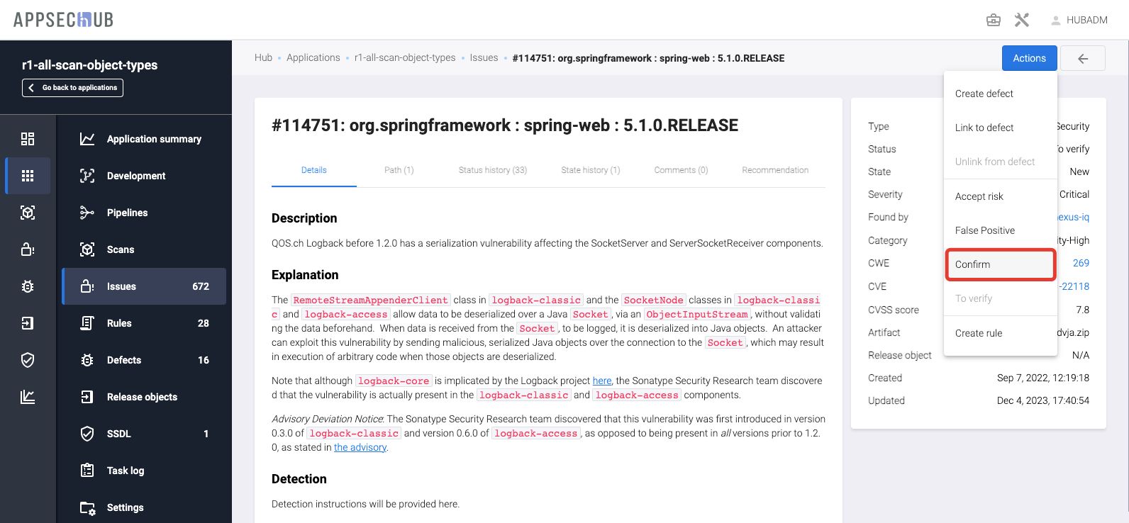 Нажмите кнопку Confirm. Проблема безопасности получит статус Confirmed.