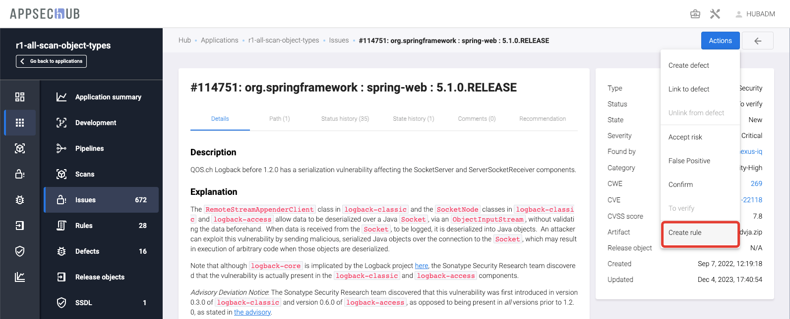 Create defect — этот пункт используется для создания нового дефекта безопасности на основе данной проблемы безопасности, см. раздел «Создание дефекта безопасности на основе проблем безопасности».