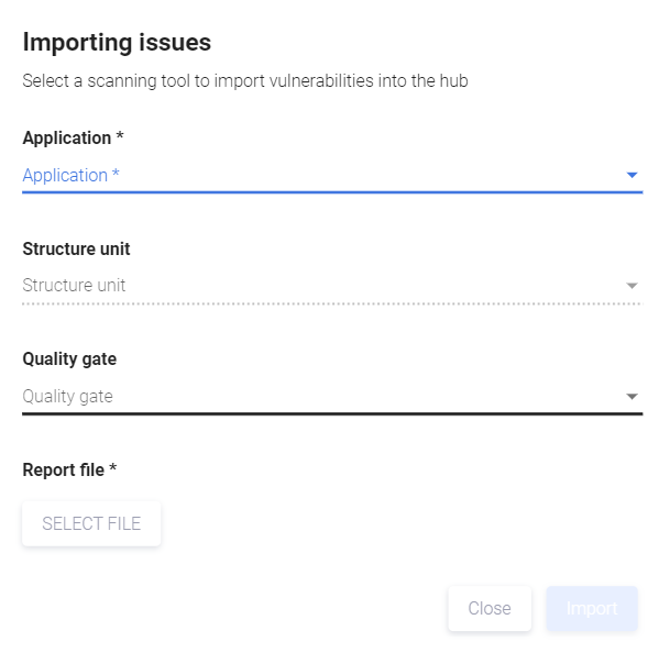 Импортируемый отчет может содержать уязвимости различных типов. Он может импортироваться как с общей страницы Issues, так и со страницы Issues приложения. В последнем случае при заполнении параметров не потребуется указывать приложение.
