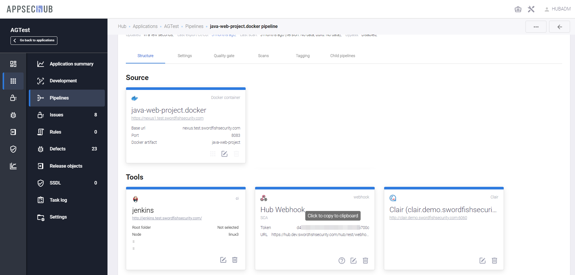 Следующая карточка для этого пайплайна — карточка инструмента AST. В данном примере это инструмент Clair. Для одного пайплайна может быть использовано несколько инструментов сканирования. Нажмите иконку редактирования
