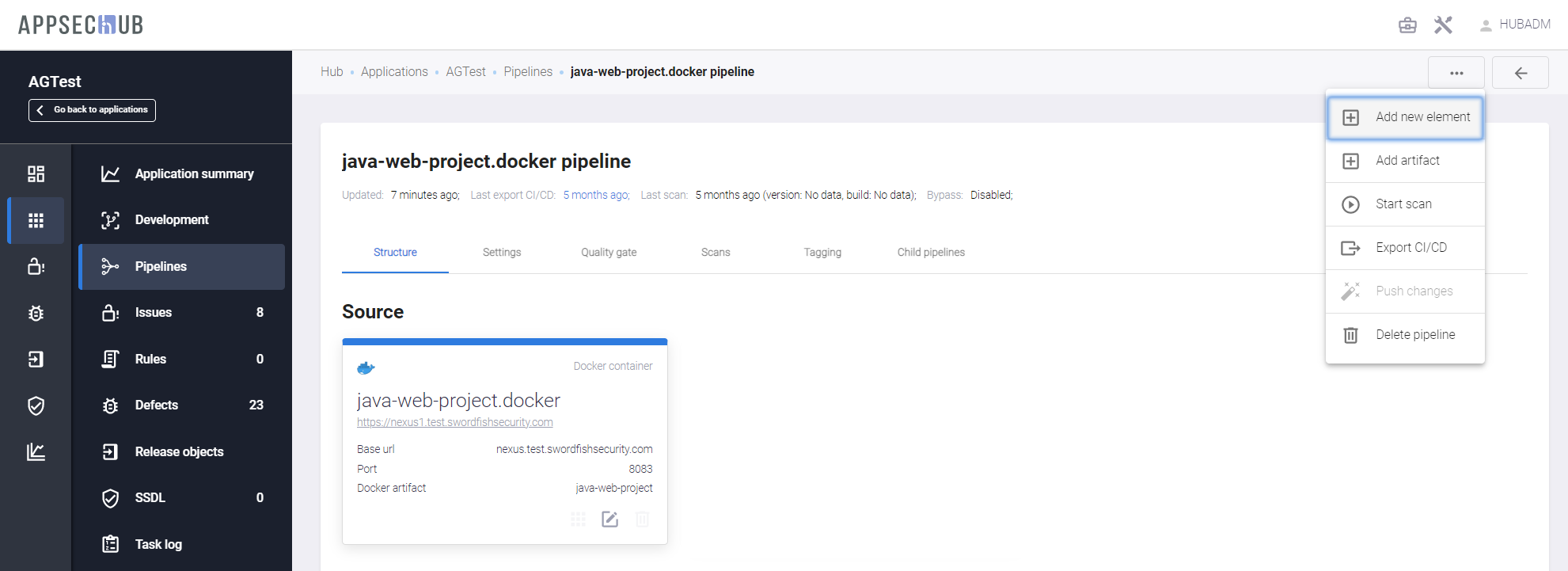 С точки зрения безопасности приложения, каждый артефакт можно просканировать, чтобы найти проблемы информационной безопасности. AppSec.Hub автоматизирует этот процесс и поддерживает DevSecOps пайплайны артефактов. Выберите пункт меню Pipelines в консоли слева и нажмите идентификатор пайплайна артефакта (имеющего значение Artifact в поле Type), чтобы просмотреть подробную информацию о нем.