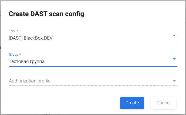 В появившемся окне Create DAST scan config выберите инструмент в поле Tool.