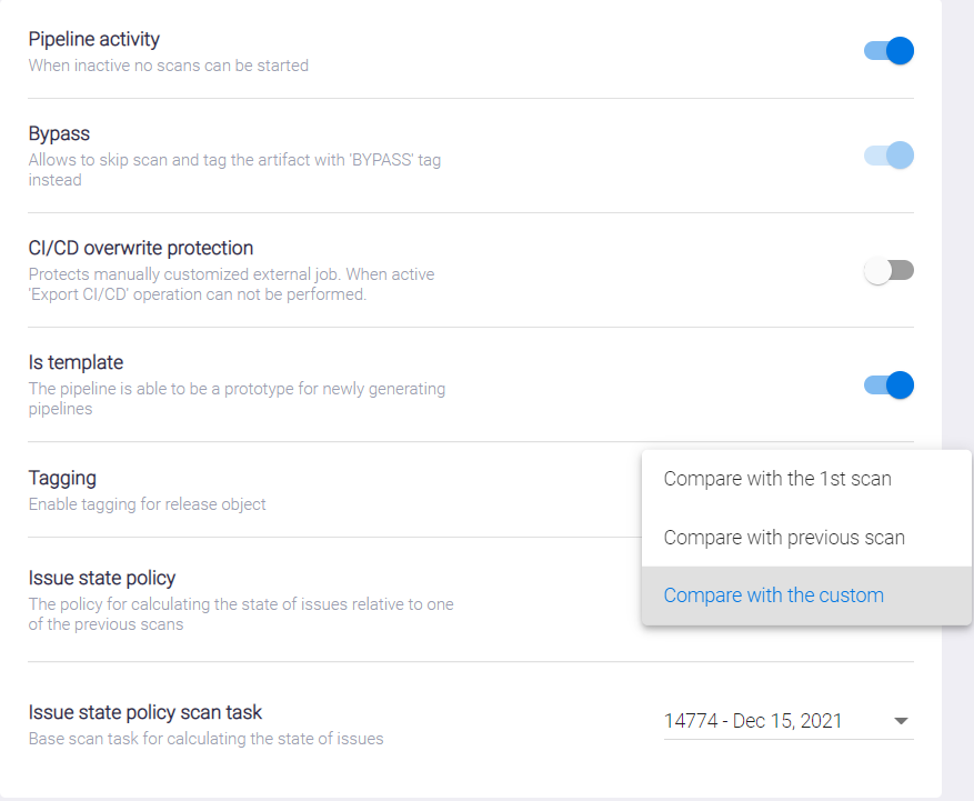 - Compare with the custom — определять состояние обнаруживаемых проблем безопасности в сравнении с результатами произвольного успешного сканирования. При выборе этого варианта на вкладке Settings настроек Security Pipelines появляется дополнительное поле Issue state policy scan task, в котором необходимо указать соответствующее сканирование.