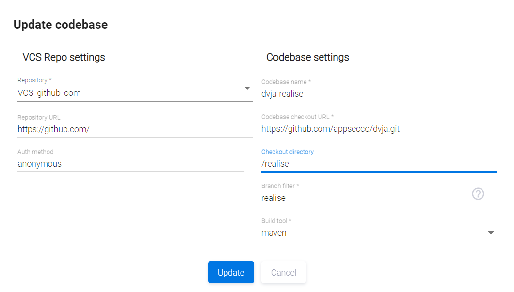 - Используемый инструмент VCS (Version Control System, система управления версиями), URL кодовой базы, тип ветки кода, инструмент сборки.