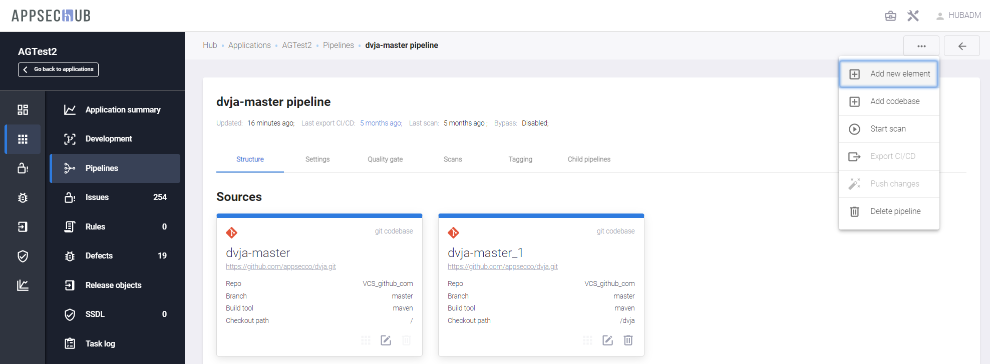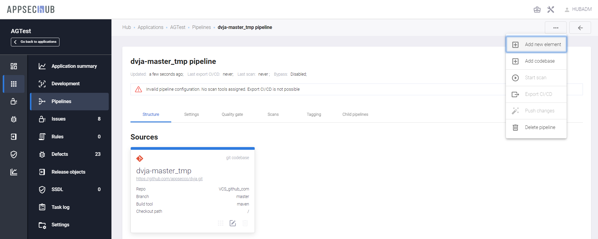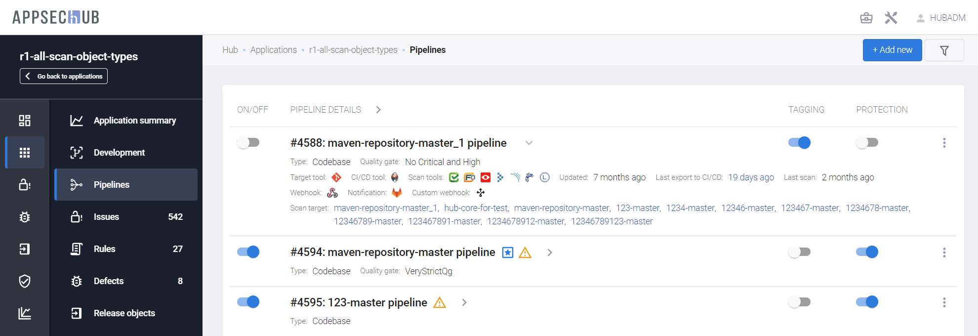 AppSec.Hub предоставляет возможность настройки существующих и создания новых Security Pipelines, а также запуска сканирования безопасности с их помощью.