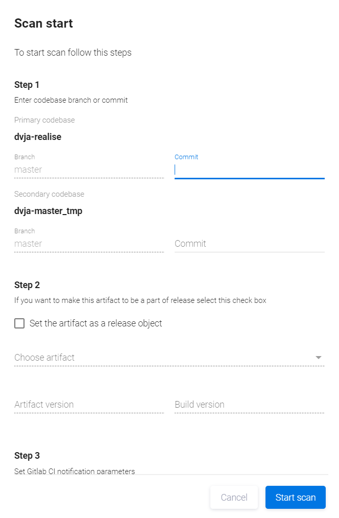 После добавления Notification config в security pipeline кодовой базы при запуске сканирования в окне Scan start появится дополнительный третий шаг (Step 3), позволяющий установить параметры конфигурации уведомлений GitLab CI.