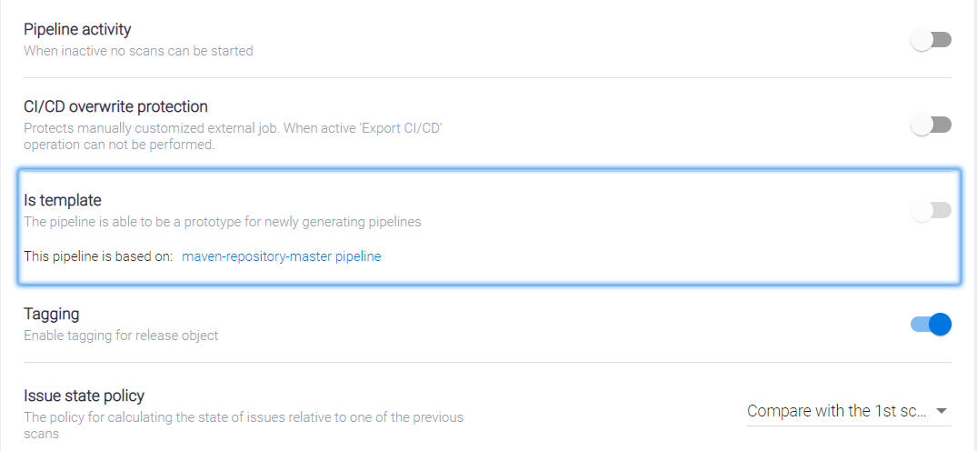 В AppSec.Hub пайплайн может быть использован в качестве шаблона для других пайплайнов. Как уже было сказано в разделе «Настройки security pipeline», для этого на вкладке Settings данного пайплайна должен быть включен переключатель Is template. Дочерние пайплайны, созданные с помощью шаблона, не могут быть в свою очередь использованы как шаблон для создания других пайплайнов.