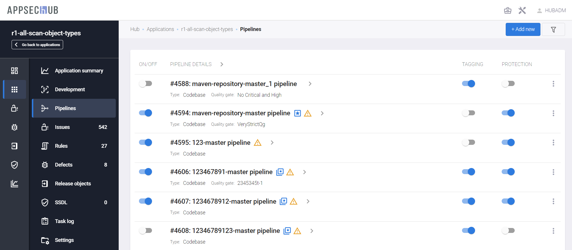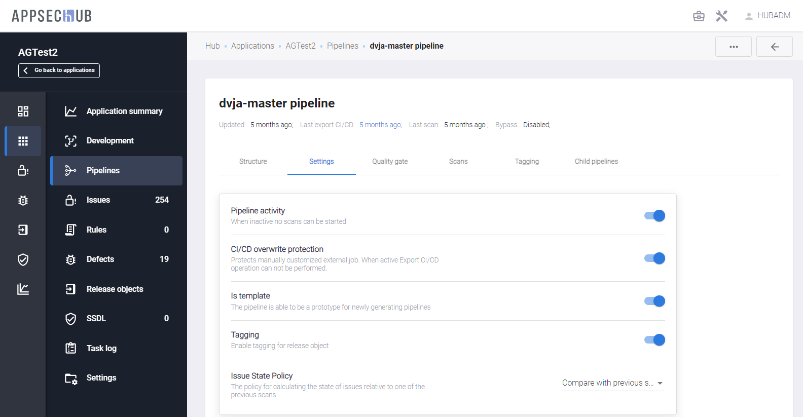- Pipeline activity — если этот переключатель выключен, Security Pipeline не может быть запущена на сканирование. Состояние этой настройки пайплайна в AppSec.Hub отображается на странице PIPELINES с помощью переключателя пайплайна (ON/OFF). Если переключатель выключен и имеет серый цвет, Security Pipeline не может быть запущена на сканирование. Если переключатель включен и имеет синий цвет, Security Pipeline может быть запущена на сканирование.