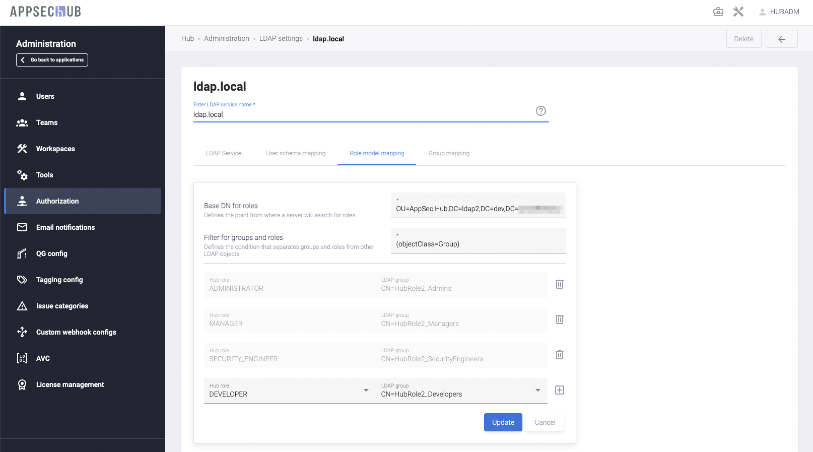 4. В появившихся полях попарно сопоставьте роли AppSec.Hub (Hub role) с группами LDAP (LDAP group).