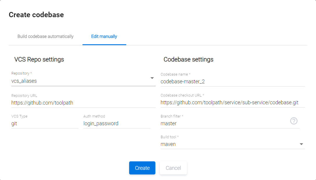 При создании кодовой базы с помощью кнопки +Add new и пункта выпадающего меню Add new codebase в поле Enter absolute codebase URL окна Create codebase, как и в примере с онбордингом, можно указать URL, соответствующий заданному алиасу — ssh://git@github.com:7999/aliaspath/service/sub-service/codebase.git.