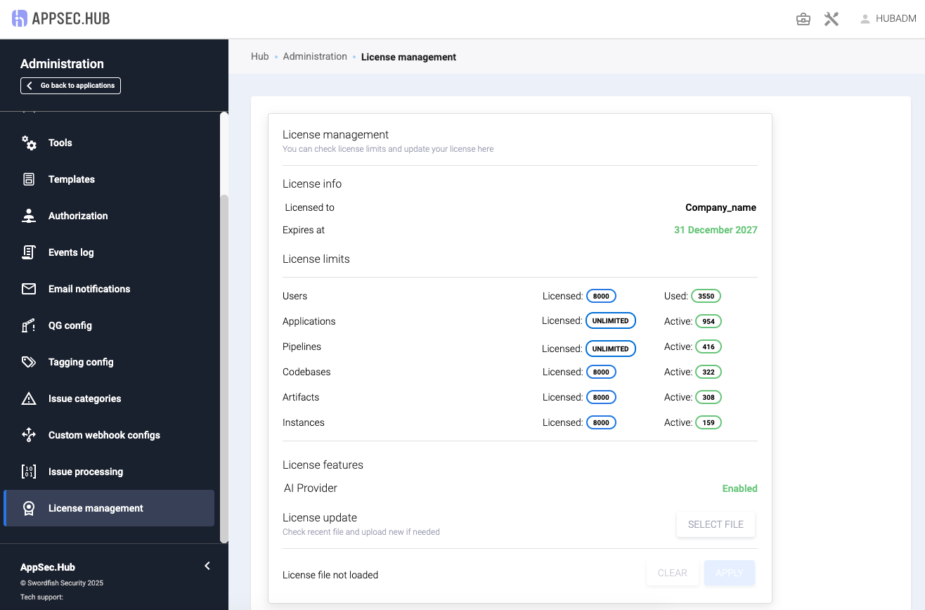 Начиная с версии 2023.4.3, в системе реализовано управление количеством пользователей, приложений, пайплайнов, кодовых баз, артефактов и экземпляров приложений (инстансов) через лицензии AppSec.Hub. При переходе на версию 2023.4.3 необходимо получить лицензионный файл нового формата и обновить лицензию.