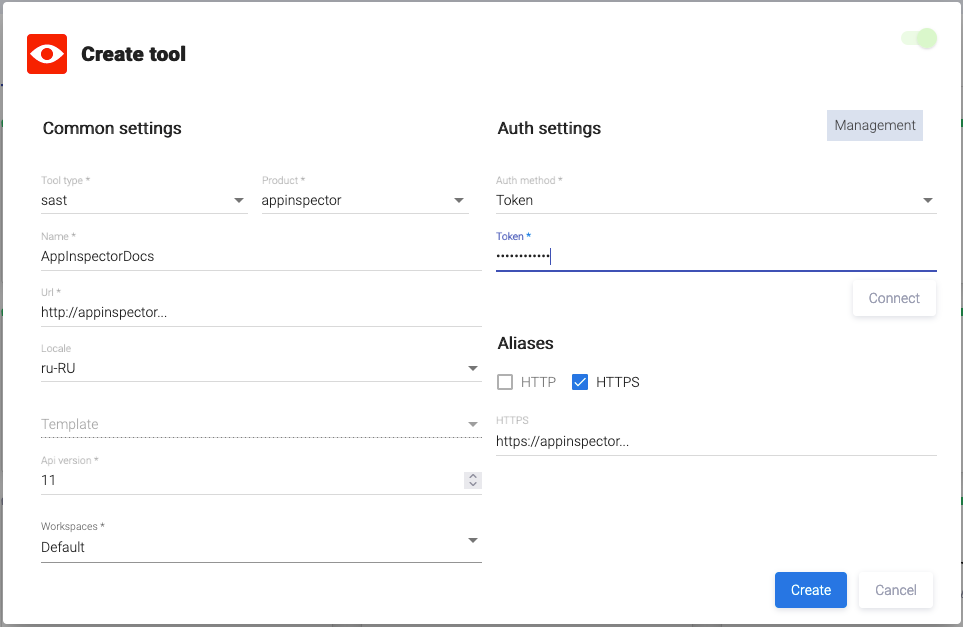 В раскрывающемся меню поля Tool type открывшегося диалогового окна Create tool выберите пункт sast, а в поле Product — appscreener.