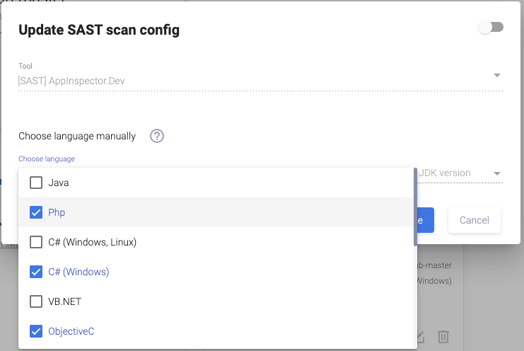 В поле Languages осуществляется выбор языка (-ов) исходного кода приложения, которые будут проверяться во время сканирования, см. раздел «Пайплайн исходного кода».