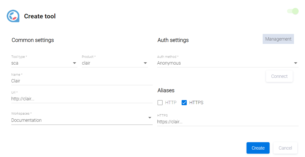 В появившемся окне Create tool выберите элемент sca из выпадающего меню в поле Tool type и элемент aquasec из выпадающего меню в поле Product.