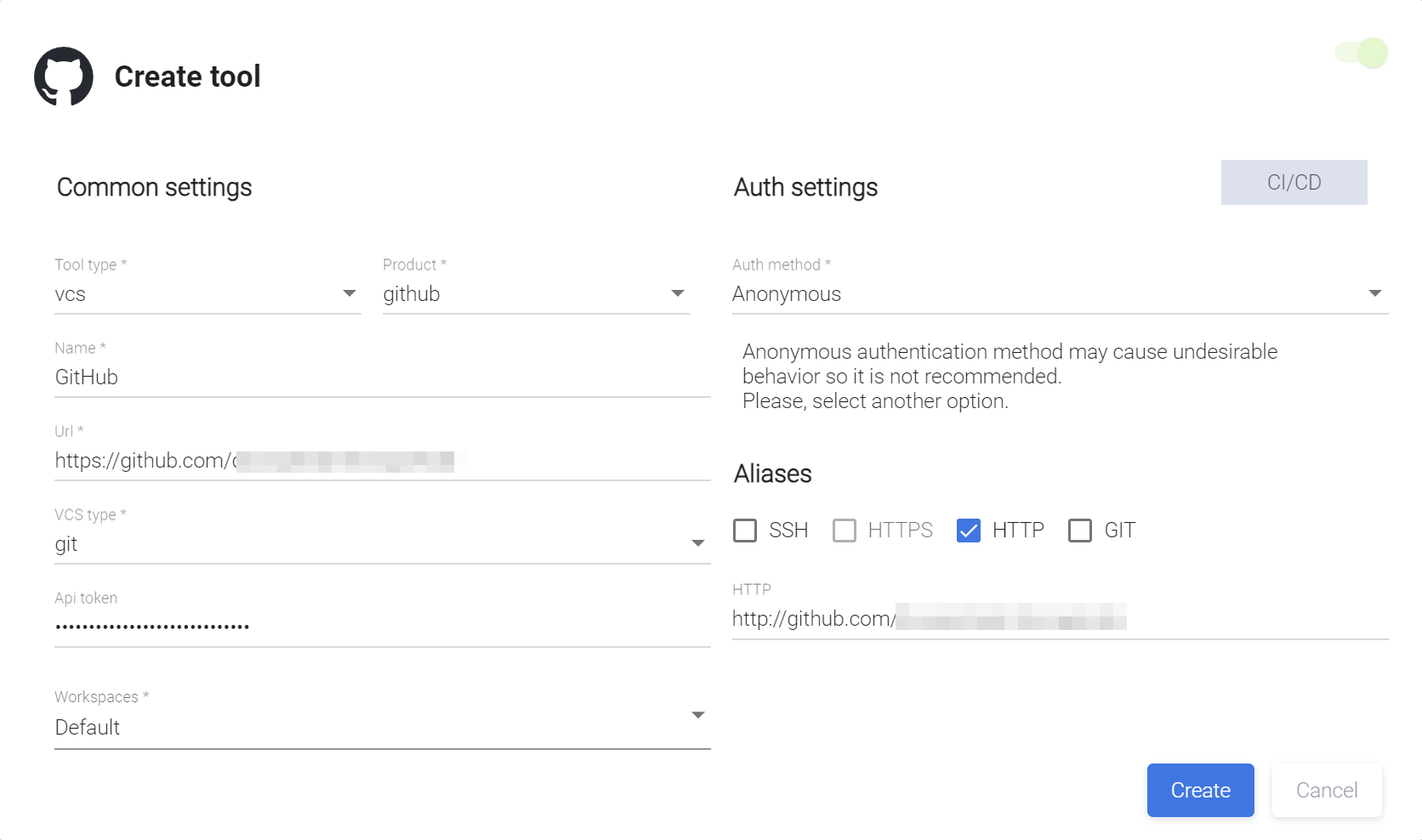 В поле Product выберите github. В окне Create tool появятся несколько дополнительных полей.