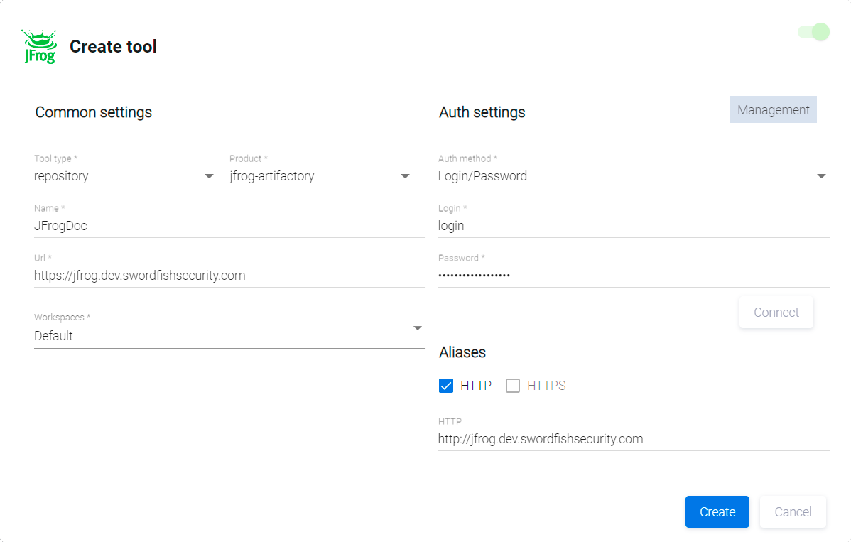 В открывшемся окне Create tool выберите элемент repository из выпадающего меню в поле Tool type и элемент jfrog-artifactory в поле Product.