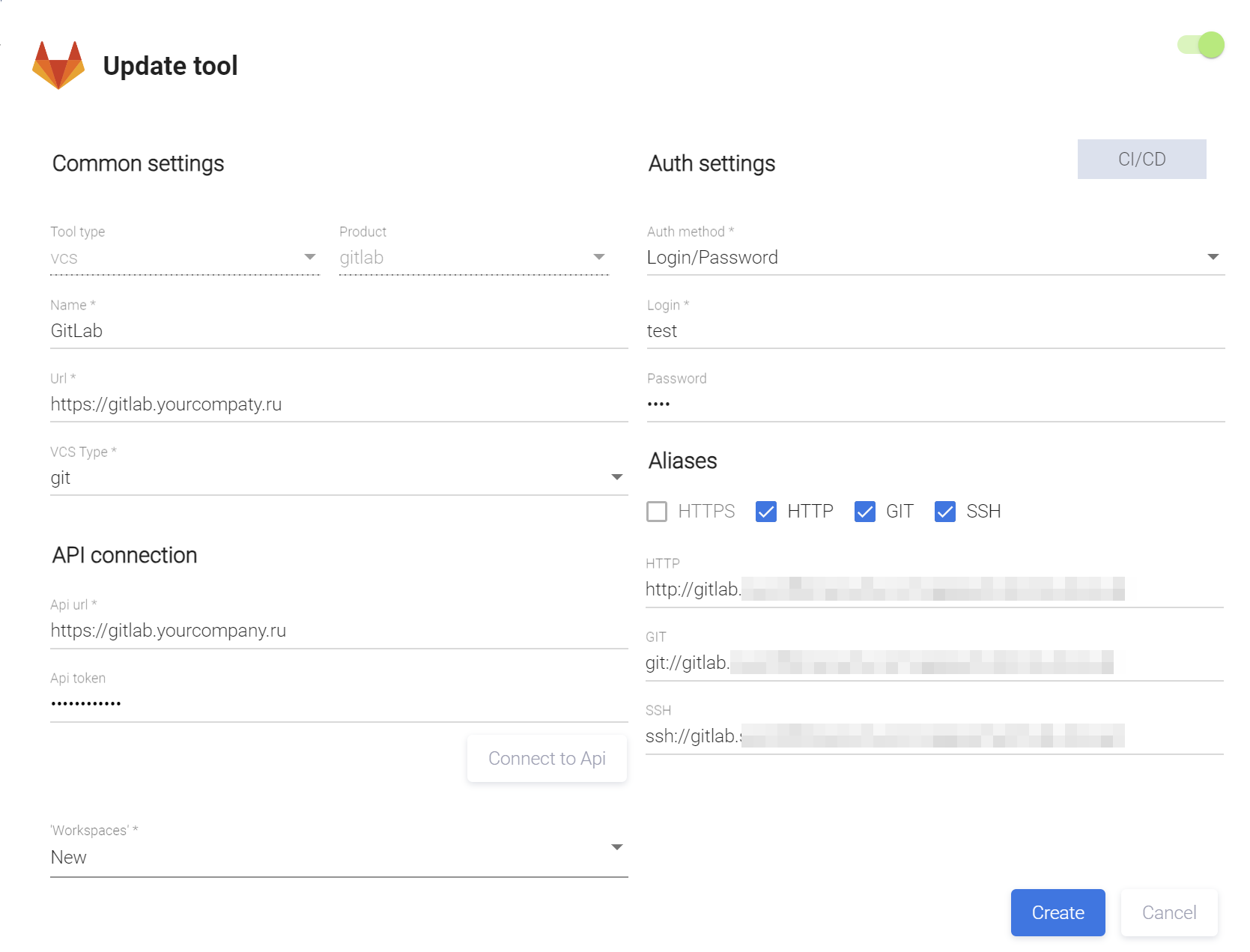 В появившемся окне Create tool выберите ci в поле Tool type и gitlab_ci в поле Product.