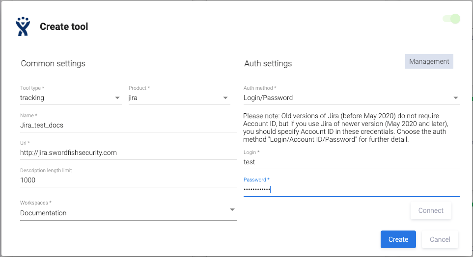 Перед подключением к инструменту убедитесь, что селектор в правом верхнем углу окна Create tool находится в положении «включено», и нажмите на кнопку Create. В правом нижнем углу экрана появится уведомление, подтверждающее успешное соединение с Jira.