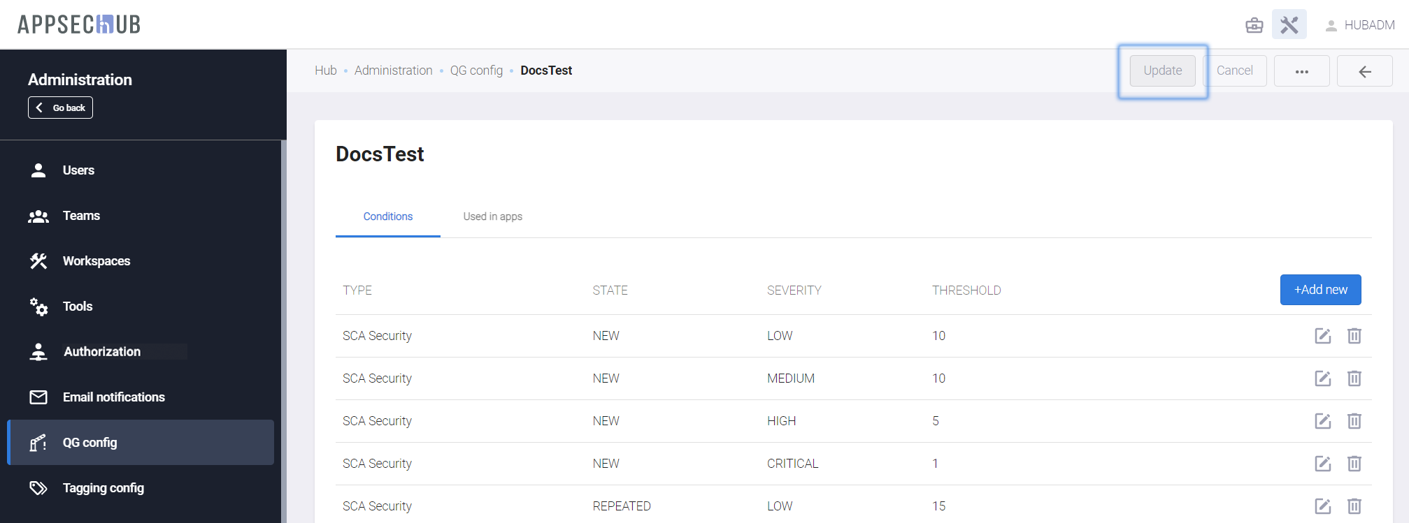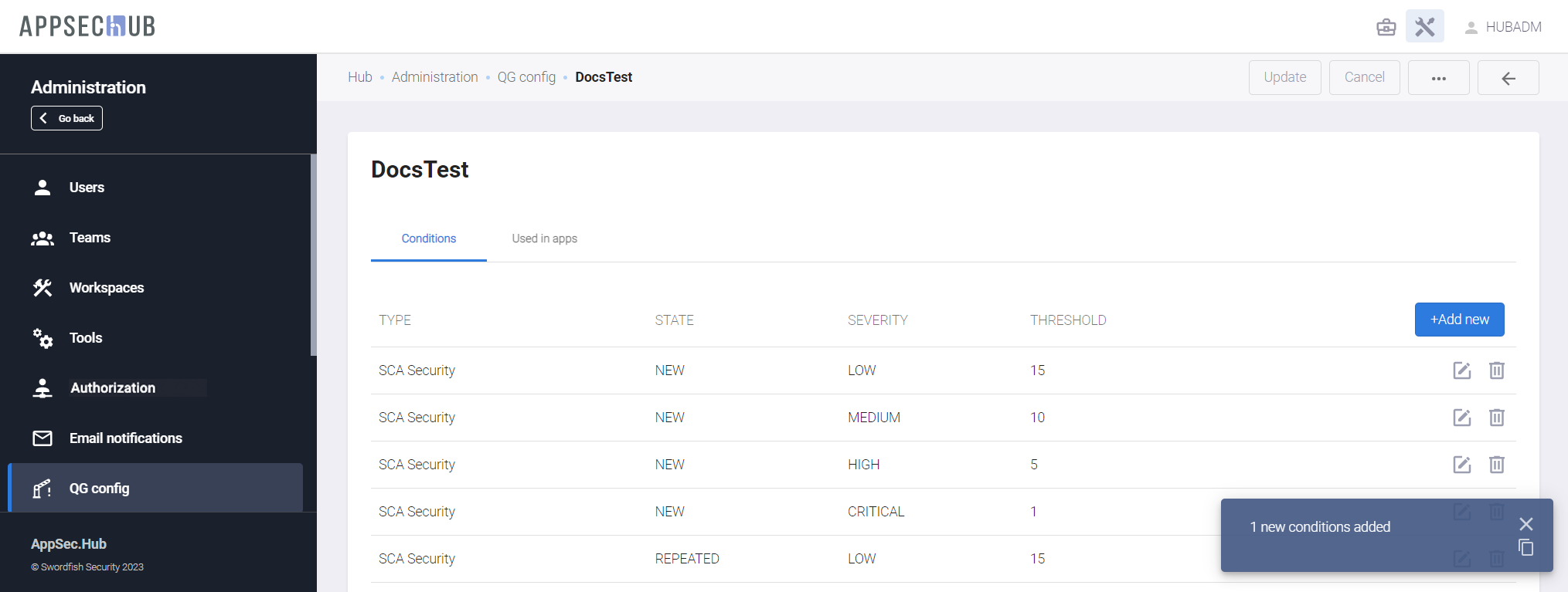 Для добавления в Quality Gate условий перейдите на страницу настройки профиля Quality Gate (см. раздел «Настройка профиля Quality Gate») и нажмите кнопку +Add new.