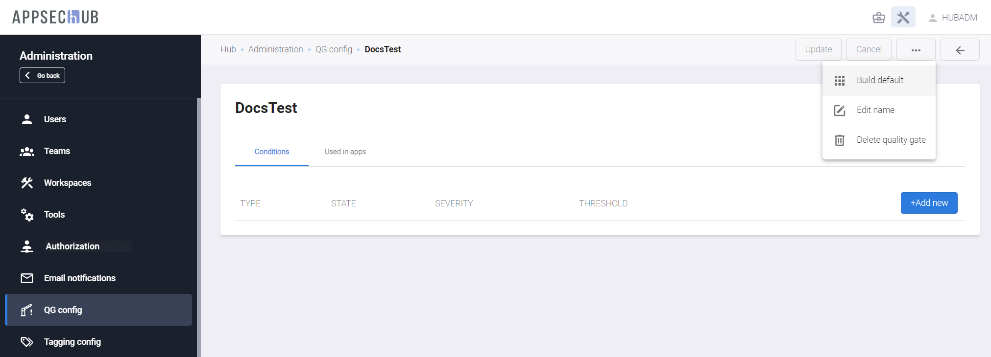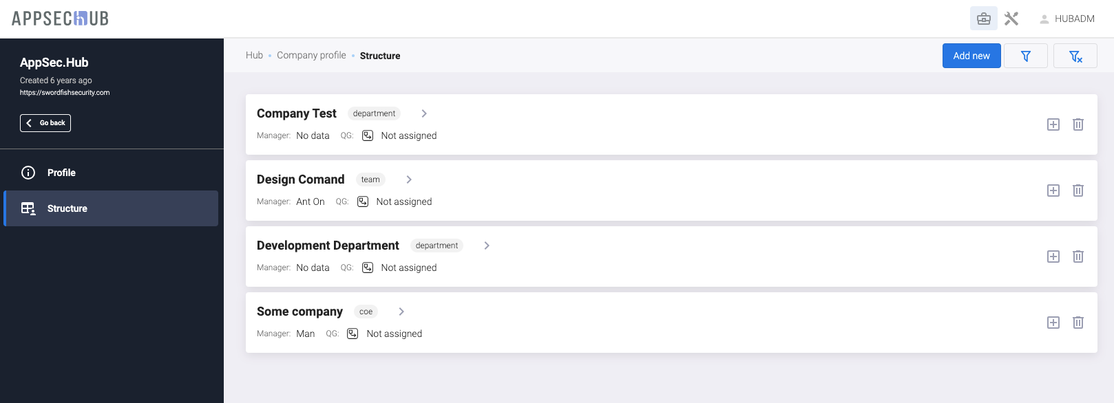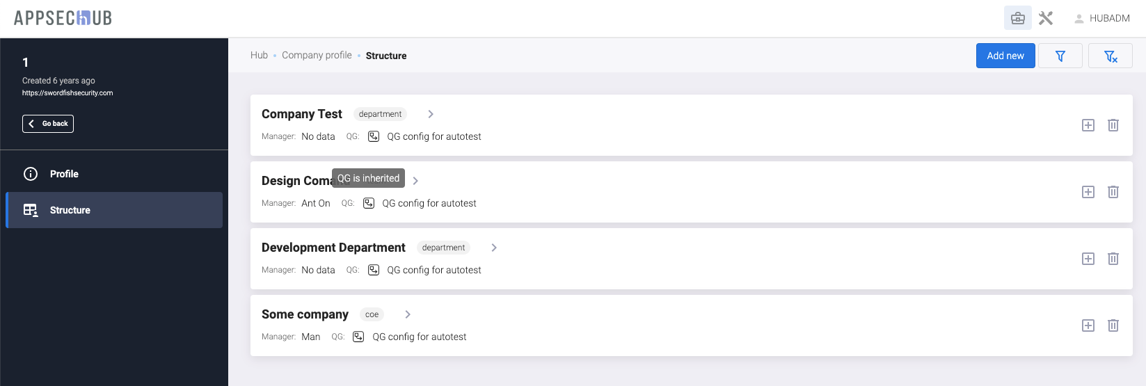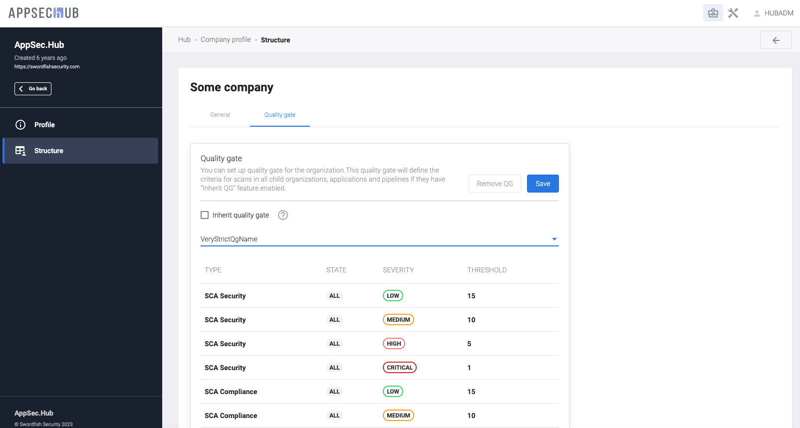 В AppSec.Hub реализовано централизованное управление Quality Gates. Созданный в системе конфигурационный профиль Quality Gate (см. раздел «Создание профиля Quality Gate») может быть применен к различным объектам системы – на уровне компании, подразделения организационной структуры, приложения или пайплайна.
