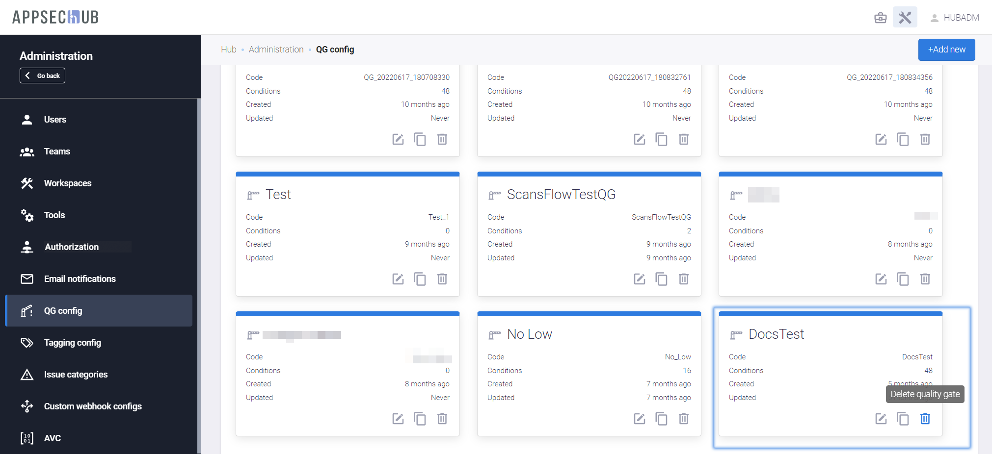 Чтобы удалить профиль Quality Gate, перейдите на страницу QG Config, см. раздел «Создание профиля Quality Gate». В правом нижнем углу карточки Quality Gate нажмите иконку Delete Quality Gate