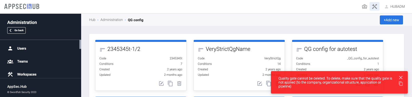 Если предпринимается попытка удаления Quality Gate, который используется в каких-либо объектах системы – на уровне компании, подразделения организационной структуры, приложения или пайплайна, в правом нижнем углу пользовательского интерфейса отображается соответствующее предупреждение.