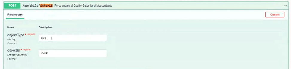 Включение принудительного наследования Quality Gates у всех объектов вниз по дереву от вышестоящего объекта можно осуществить в Swagger с помощью вызова метода <hub-url>/hub/rest/swagger-ui/index.html#/quality-gate-rest/setChildQualityGate с параметрами: