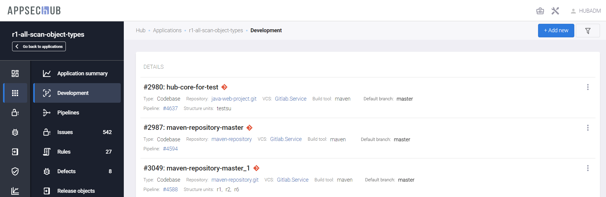Если тип структурной единицы структуры приложения определен как микросервис, структурные единицы соответствующего типа могут быть созданы с помощью кнопки +Add new страницы разработки приложения Development.