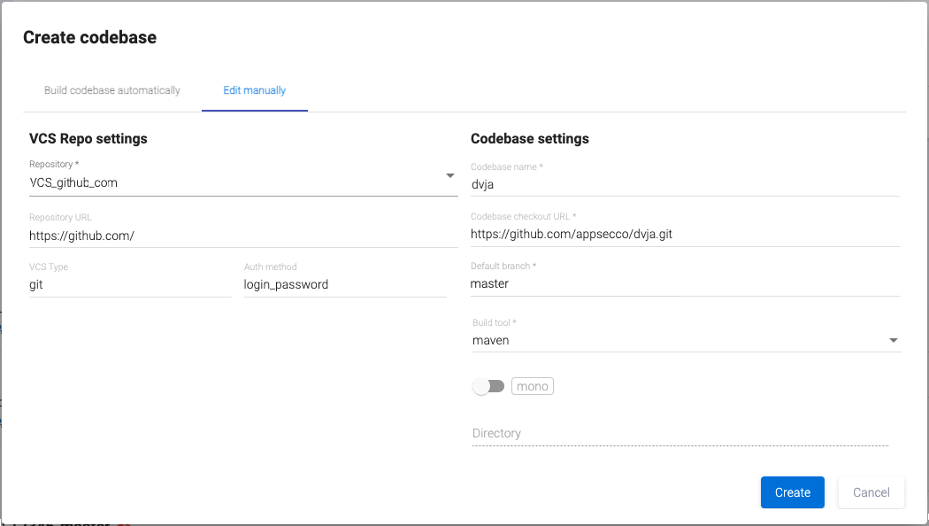 Нажмите на кнопку Create, чтобы создать новую кодовую базу в AppSec.Hub.