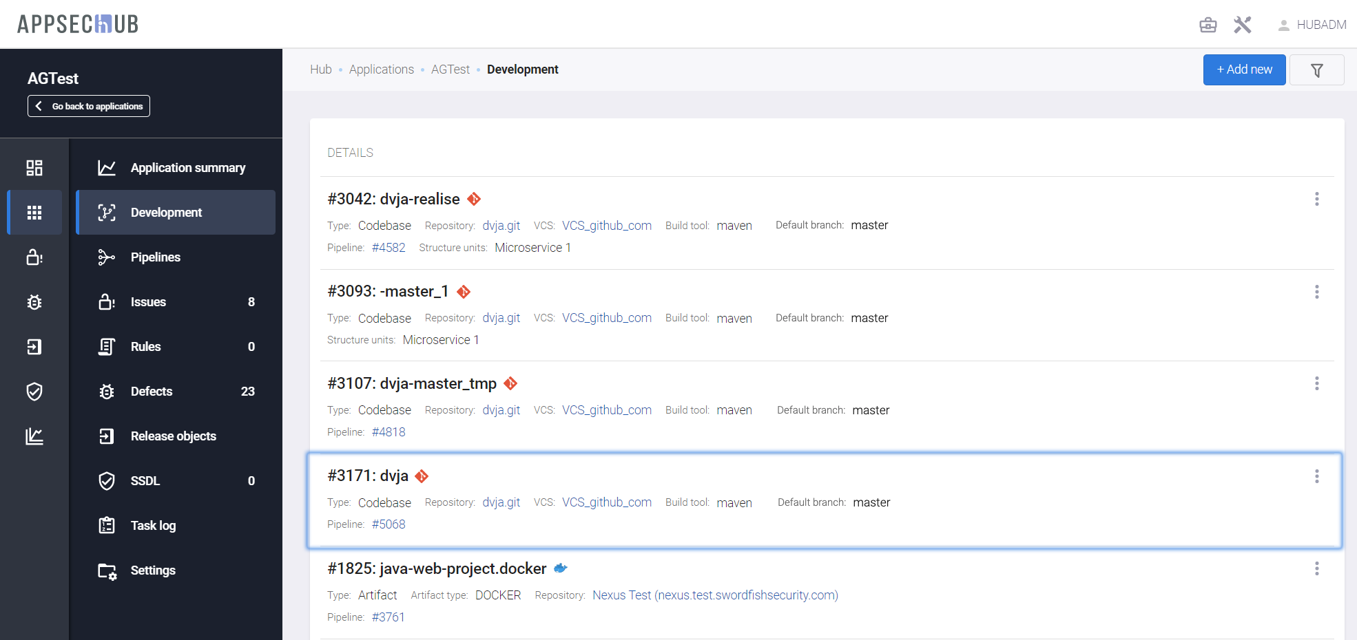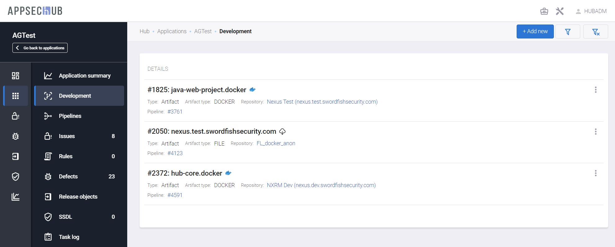 Для создания нового артефакта выберите пункт меню Development, а затем нажмите кнопку +Add new в правом верхнем углу и выберите пункт выпадающего меню Add new Artifact, или нажмите на идентификатор # существующего артефакта, чтобы проверить и/или сконфигурировать параметры артефакта.